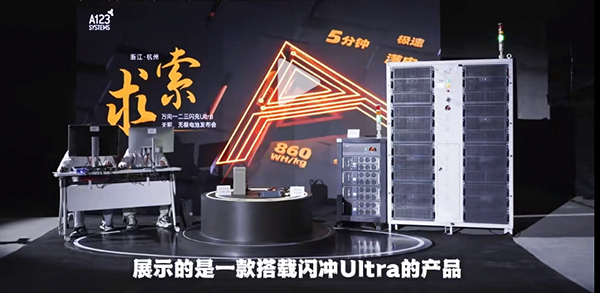 8868体育150V 400A模组充放电测试系统(右一)、8868体育10V300A电芯充放电测试系统(右二)出现在万向一二三12C超高倍率“闪充Ultra电池”发布会视频中